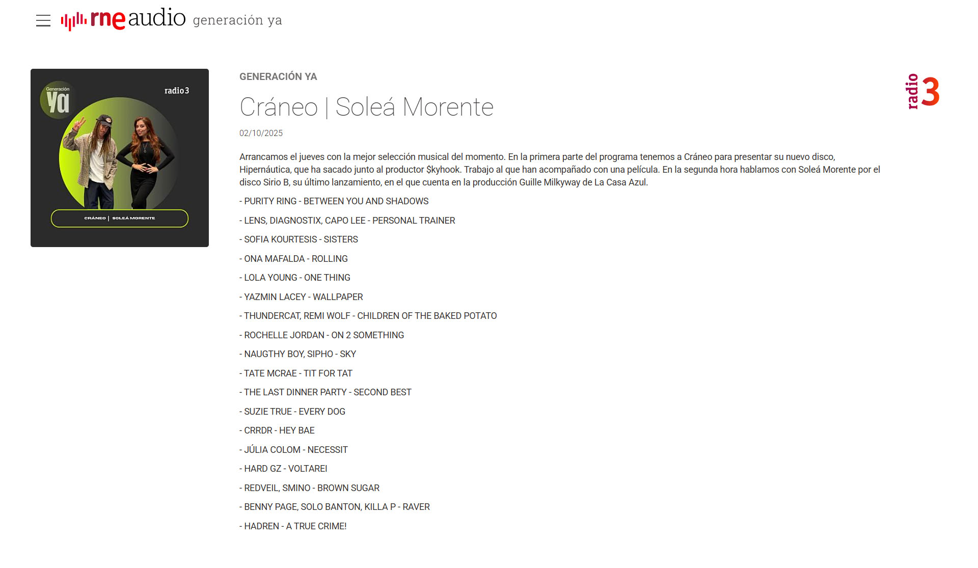 Radio 3, Programa Generación Ya! [Es]: “SirioB” hablamos con Soleá Morente por el disco Sirio B, su último lanzamiento, en el que cuenta en la producción Guille Milkyway de La Casa Azul
